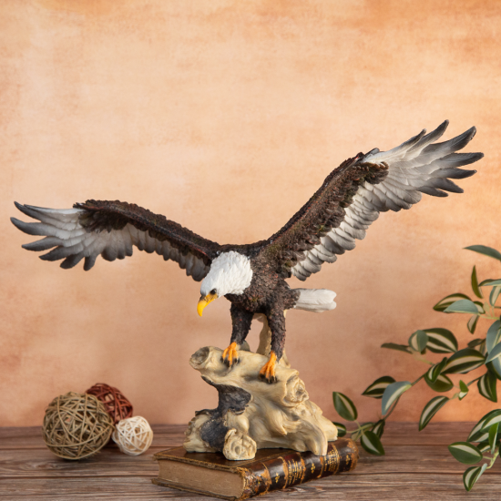 Тази впечатляваща статуетка "Орел в полет над скали" ще ви пренесе в необятните простори на дивата природа. Величественият орел, изработен с изключителна прецизност от полирезин, сякаш е уловил мига на чистата свобода. Разперените му крила и динамичната поза излъчват мощ и грация.