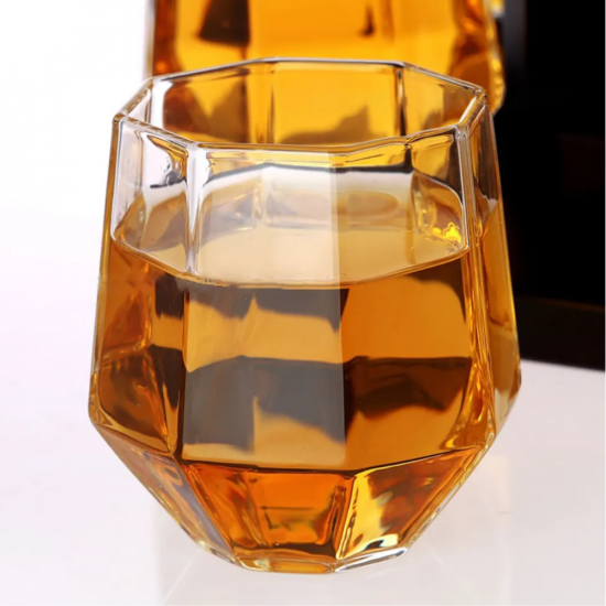 В сърцето на комплекта е внушителната гарафа с форма на диамант (800 мл), изработена от чисто стъкло. Нейните прецизно оформени ръбове улавят светлината, разкривайки богатата палитра от златни оттенъци на Вашето любимо уиски. Допълнена от четири елегантни чаши (300 мл.), също с диамантена форма, тя създава завършена картина на лукс и стил.